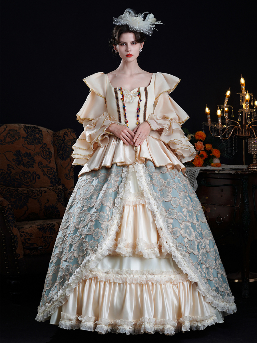 Rokoko-Damenkleid im Vintage-Stil mit Farbblockmuster Rüschen langen Ärmeln und Farbblock-Ballkleid