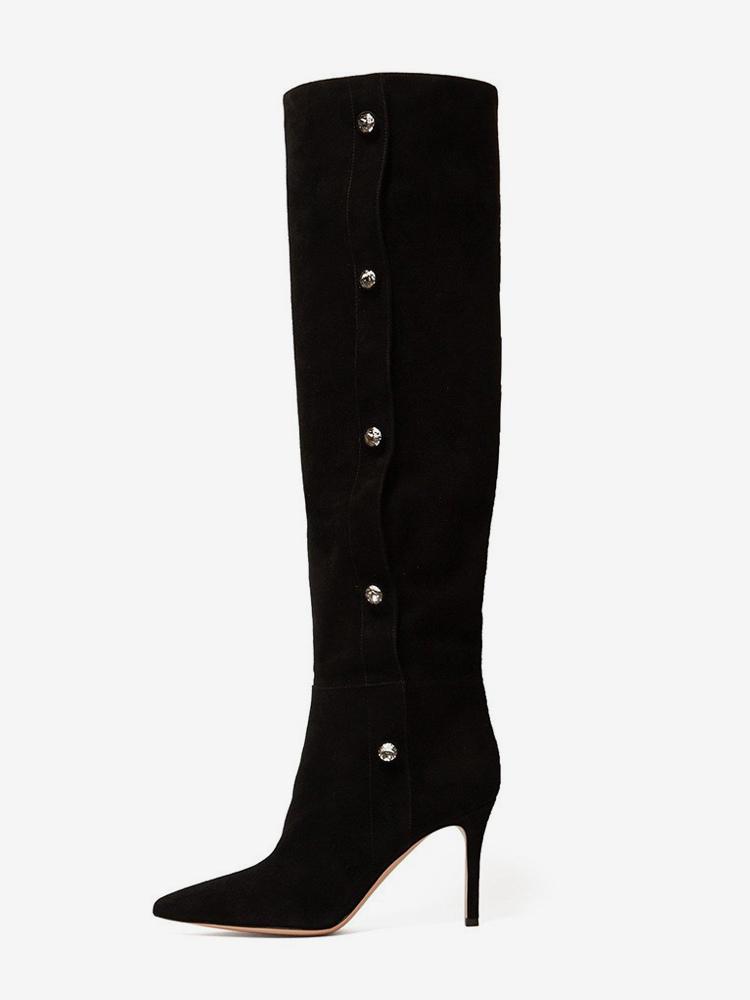 Botas de gamuza hasta la rodilla con punta puntiaguda y tacón alto con cuentas para mujer