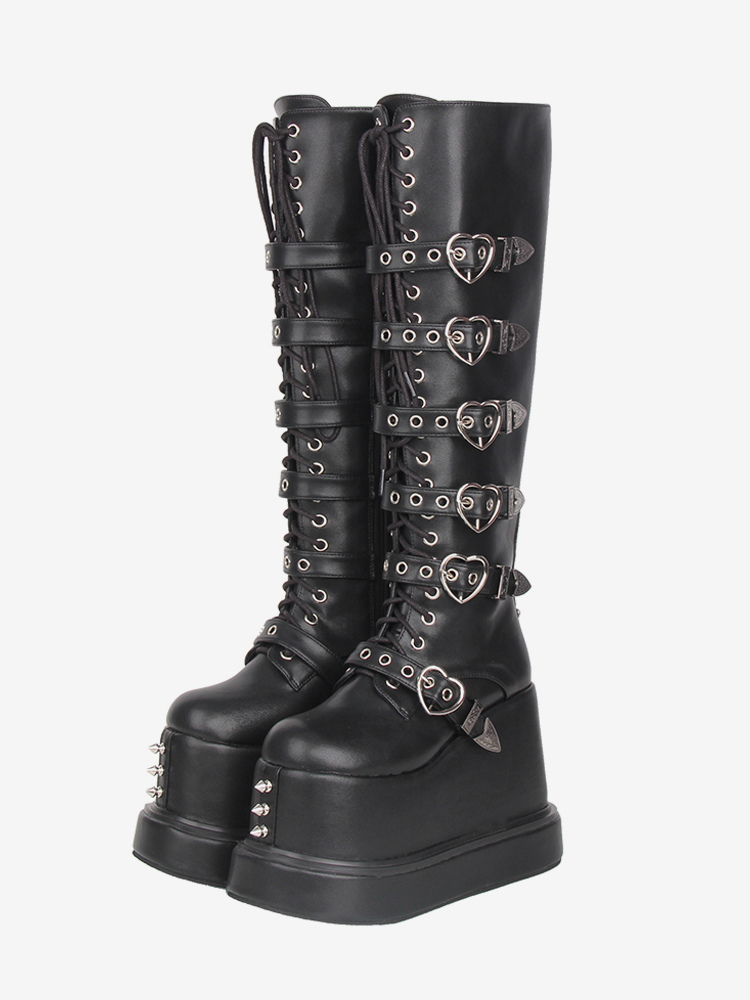 Botas góticas Lolita de piel sintética con punta redonda y tacón de cuña negro.