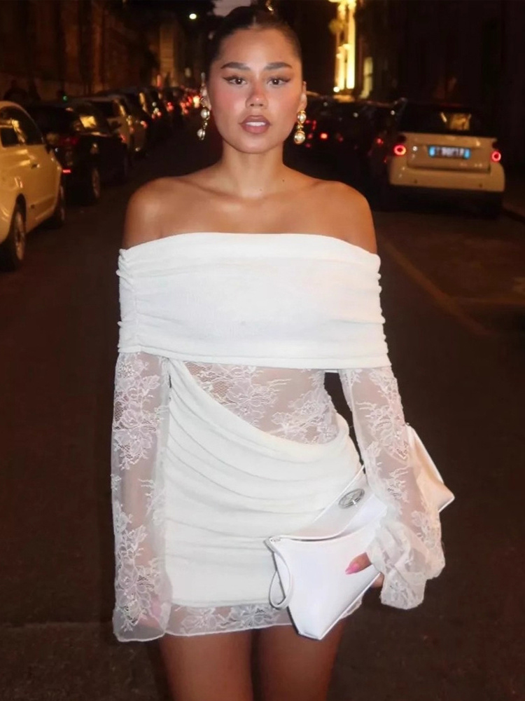 Vestido mini ajustado con hombros descubiertos manga larga y fruncido de encaje para mujer 2026