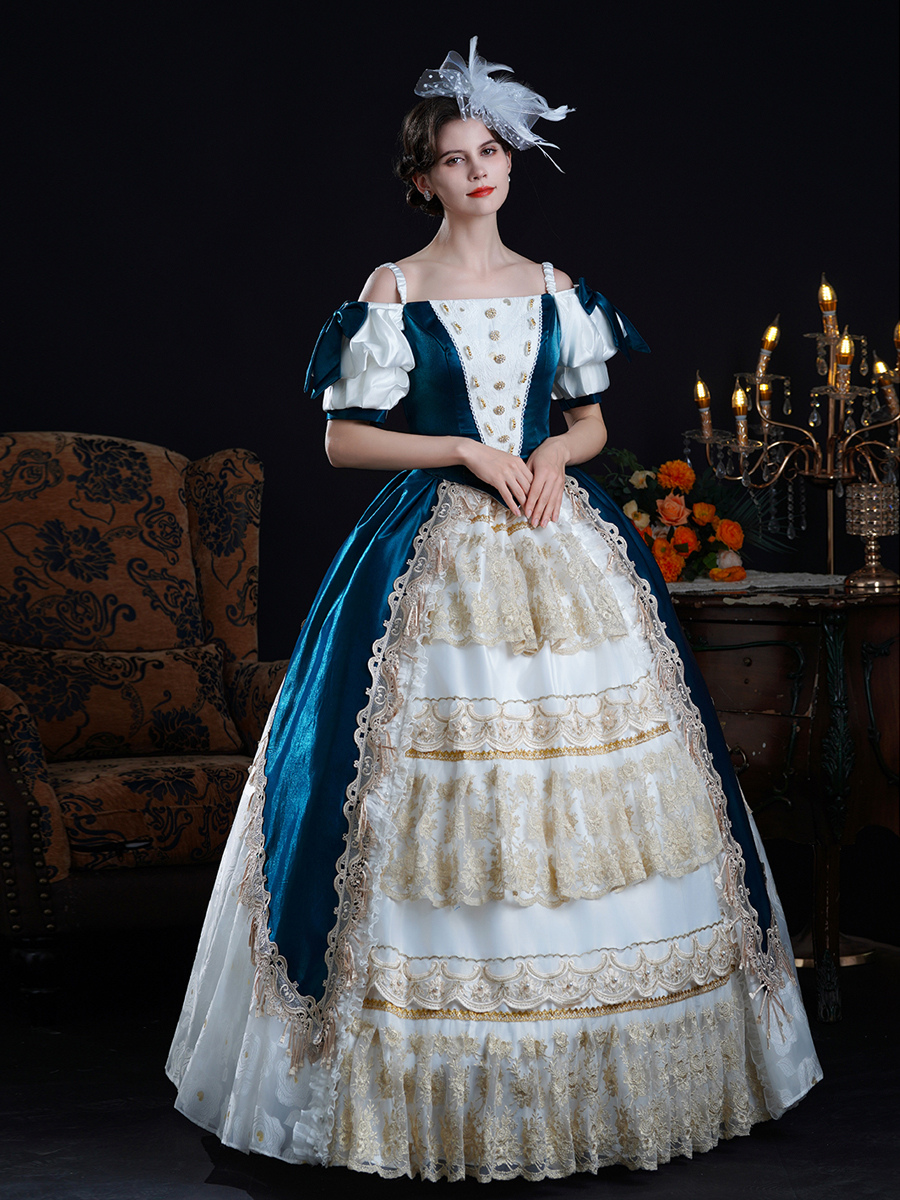 Vestido rococó vintage para mujer con lazos volantes bloques de color manga corta vestido de gala