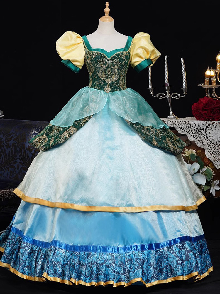 Abito da donna in stile rococò vintage a maniche corte con fiocchi e volant a blocchi di colore