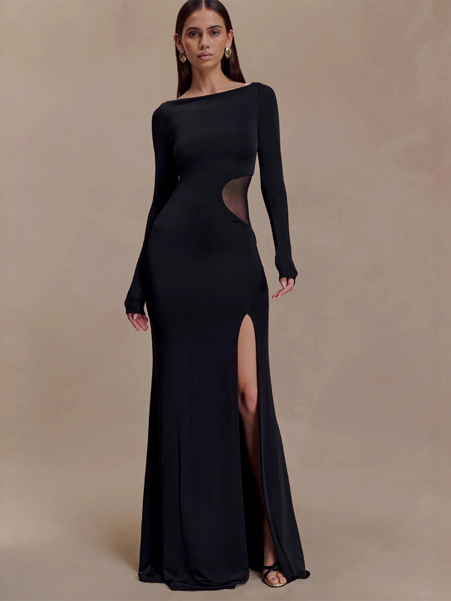 Abito da sera lungo aderente con spacco laterale in rete e maniche lunghe per donna 2026