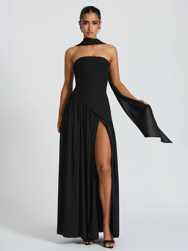 Abito lungo da festa senza spalline con design asimmetrico e sciarpa per donna 2026